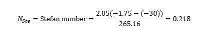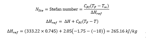 ตัวอย่างที่1 : เนื้อวัวมีลักษณะเป็นก้อนสี่เหลี่ยม โดยมีขนาดความยาว (C) 1 เมตร ความกว้าง (b) 0.6 เมตร และ ความหนา(a) 0.25 เมตร โดยมีค่าสัมประสิทธิ์การพาความร้อน hc = 30W/(m2 K), อุณหภูมิสินค้าเริ่มต้น Ti= 5 oC , อุณหภูมิสินค้าสุดท้าย T = -10 oC , อุณหภูมิอากาศภาย ในห้อง T∞ = -30 oC , ความหนาแน่นของสินค้า ρ = 1,050 kg/m3 , ความร้อนแฝงของการเยือกแข็ง LV = 333.22 kJ/kg , เปอร์เซ็นต์น้ำในสินค้า (Moisture Contain) 74.5% , ค่าสัมประสิทธิ์การนำความร้อน kI = 1.108 W/(m K) และ อุณหภูมิจุดเยือกแข็งสินค้า TF = -1.75 oC จงคำนวณหาเวลาที่ใช้ในการแช่แข็งจากสมการ Plank