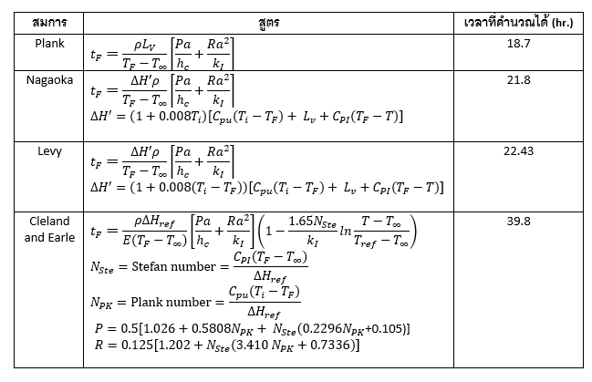 จากโจทย์ปัญหาการแช่เยือกแข็งเนื้อวัวข้างต้น โดยอาศัยสมการการคำนวณเวลาที่ใช้ในการแช่เยือกแข็งได้สรุปรายละเอียดดังตารางที่2