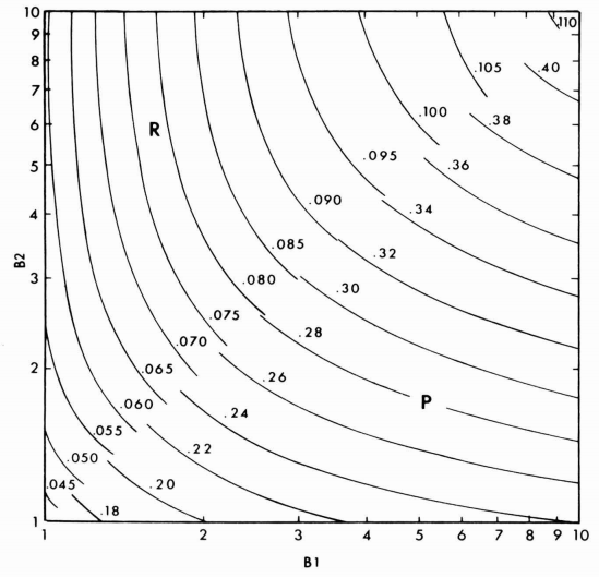 หาค่าของ B1 = 0.6/0.25 = 2.4 และ B2 = 1/0.25 ดังนั้นจากรูปที่ 1 ค่า P,R มีค่าเท่ากับ P = 0.3 และ R = 0.085