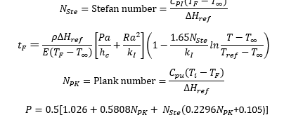 จากบทความตอนที่แล้วได้กล่าวถึงรายละเอียด สาเหตุที่มาของเวลาในการแช่เยือกแข็งว่ามีตัวแปรอะไรเป็นส่วนสำคัญ สำหรับบทความนี้จะต่อเนื่องจากบทความที่แล้ว โดยจะอ้างอิงถึงสมการที่ใช้ในการคำนวณ เพื่อทำนายเวลาที่ใช้ในการแช่เยือกแข็ง แต่ทั้งนี้เวลาดังกล่าวอาจจะมีการคลาดเคลื่อนได้ ซึ่งตัวแปรต่าง ๆ ในการคำนวนและตัวแปรที่แท้จริงในการทำงานอาจจะมีความคลาดเคลื่อนซึ่งจะต้องพิจารณากันต่อไป