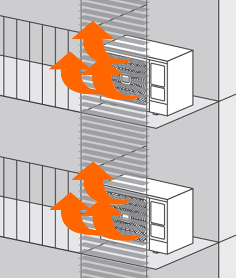 ในกรณีเช่นนี้จำเป็นที่จะต้องวางแผนตั้งแต่ขั้นตอนการออกแบบอาคาร และใช้โปรแกรม CFD (Computational Fluid Dynamics) เพื่อจำลองสภาวะการระบายความร้อนบนโปรแกรมคอมพิวเตอร์ก่อนที่จะลงมือสร้างอาคาร ถ้าผลการจำลองพบว่ามีลมร้อนย้อนกลับ หรือภาษาอังกฤษเรียกว่า Hot Air Short Cycle ก็สามารถแก้ไขได้หลายวิธี เช่น เปลี่ยนตำแหน่งการติดตั้ง คอยล์ร้อน (CDU) ให้ไม่ตรงกันในแนวดิ่งเป็นจำนวนชั้นที่มากเกินไป หรือเปลี่ยนไปใช้คอยล์ร้อน (CDU) รุ่นเป่าขึ้นสำหรับบางพื้นที่ที่มีที่ติดตั้งเพียงพอ เพราะคอยล์ร้อน (CDU) รุ่นเป่าขึ้นจะใช้พัดลมที่มีแรงดันลมสูงจึงสามารถระบายลมร้อนออกไปได้ไกลจากตัวอาคารมาก เมื่อได้แนวทางแล้วจึงทำการจำลองด้วยโปรแกรม CFD ใหม่จนกว่าผลลัพธ์จะเป็นที่พึงพอใจ