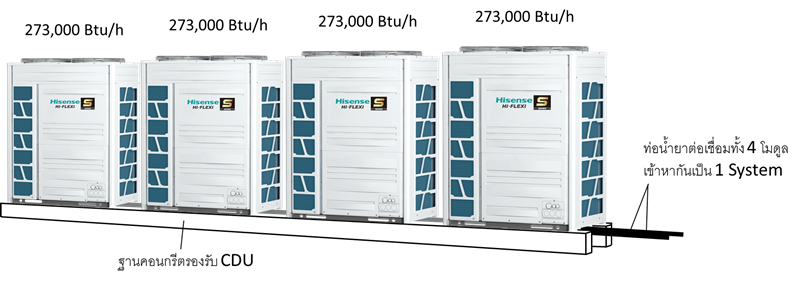 คอยล์ร้อน (CDU) 1 System อาจประกอบไปด้วย 1 โมดูล 2 โมดูล 3 โมดูลหรือ 4 โมดูลก็ได้ขึ้นอยู่กับการเลือกใช้ โดย คอยล์ร้อน (CDU) 1 โมดูลมีขนาดให้เลือกตั้งแต่ 76,000 Btu/h ถึง 273,000 Btu/h ถ้านำโมดูลขนาด 273,000 Btu/h มาต่อพ่วงกัน 4 โมดูล จะทำให้ได้ขนาดความสามารถในการทำความเย็นสูงสุดอยู่ที่ 1,092,000 Btu/h (ทั้งนี้อ้างอิงตามข้อมูลของผลิตภัณฑ์ Hisense) ระบบไฟฟ้าที่ใช้กับคอยล์ร้อน (CDU) แบบเป่าขึ้นนี้จะใช้ไฟ 380 โวลท์ 3 เฟส คอยล์ร้อน (CDU) รุ่นเป่าขึ้นจะมีพัดลมระบายความร้อนที่มีแรงดันลมสูงทำให้สามารถระบายลมร้อนออกจากตัวเครื่องได้ดีกว่าคอยล์ร้อน (CDU) รุ่นเป่าข้าง