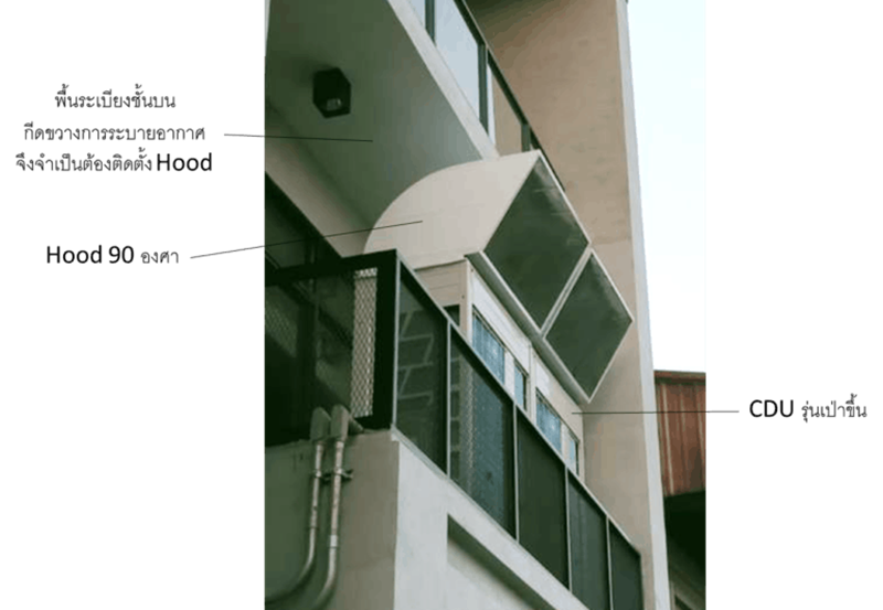การติดตั้งคอยล์ร้อน (CDU) ให้พึงระวังเรื่องการระบายลมร้อนให้ดี เพราะถ้าลมร้อนไม่สามารถระบายออกสู่บรรยากาศได้และถูก คอยล์ร้อน (CDU) ดูดกลับมา ก็จะก่อให้เกิดปัญหาความสามารถในการทำความเย็นตกและปัญหาค่าไฟสูงขึ้นได้ เช่น ถ้าเลือกใช้ คอยล์ร้อน (CDU) รุ่นเป่าขึ้นและพบว่าด้านบนมีสิ่งกีดขวางก็จำเป็นที่ผู้ติดตั้งจะต้องติดตั้ง Hood ที่ด้านบนของคอยล์ร้อน (CDU) เพื่อปรับองศาการเป่าลมร้อนให้พ้นจากสิ่งกีดขวาง มิเช่นนั้นแล้วลมร้อนจะถูกคอยล์ร้อน (CDU) ดูดกลับมาได้
