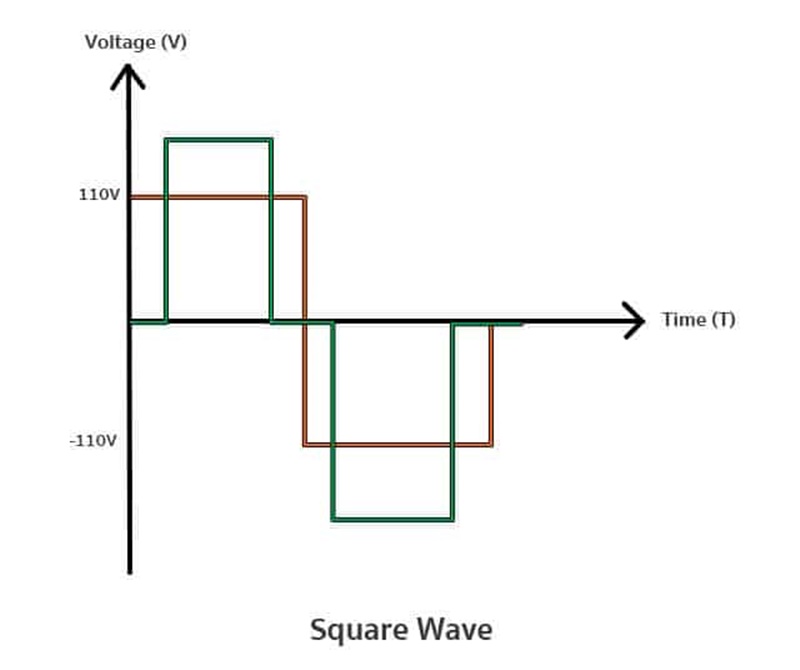 มีลักษณะรูปคลื่นเป็นทรงเหลี่ยม จุดเปลี่ยนระหว่างคลื่นบวกกับลบมีความชันน้อย ส่วนใหญ่พบกับอินเวอร์เตอร์ที่มีราคาถูกหาซื้อได้ทั่วไป อินเวอเตอร์ที่มีแรงดันขาออกเป็นแบบ 2 ลูกคลื่นนี้จะนำไปใช้กับเครื่องใช้ไฟฟ้าที่ไม่ค่อยมีผลกับรูปแบบของลูกคลื่นมากนัก