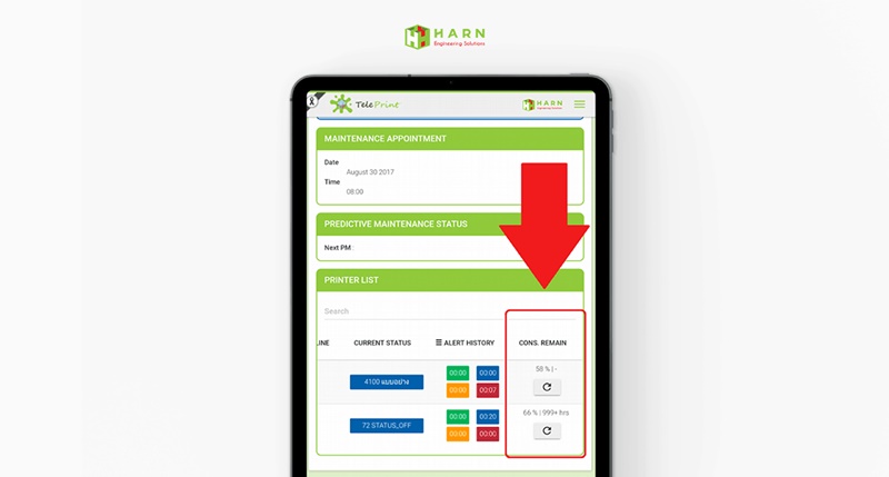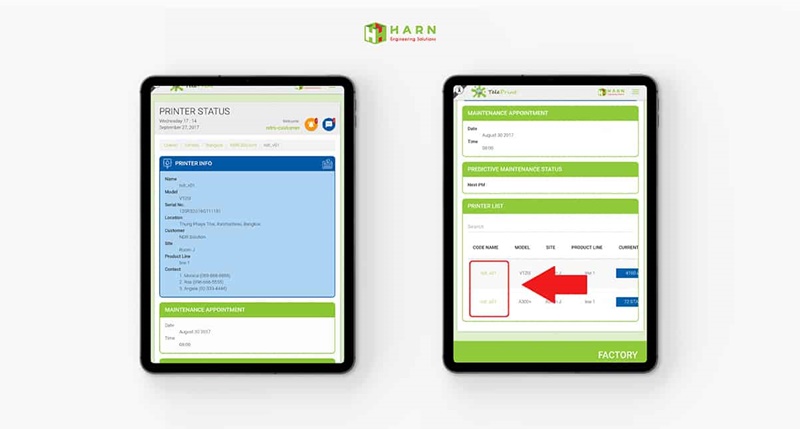 >Harn จึงได้พัฒนา ‘TelePrint’ ซึ่งเป็นแอปพลิเคชั่นที่ใช้เพื่อมอนิเตอร์การทำงานของเครื่องพิมพ์ดิจิทัลทั้งแบบ A-Series และ V-Series ไม่ว่าเครื่องพิมพ์ของลูกค้าจะอยู่ในพื้นที่กรุงเทพมหานคร หรือต่างจังหวัด ทางทีมเซอร์วิสจะเห็นปัญหาที่เกิดขึ้นของเครื่องได้อย่างทันเวลา และเตรียมอุปกรณ์ในการตรวจเช็คสภาพหรือเพื่อเปลี่ยนให้กับเครื่องพิมพ์ได้อย่างเหมาะสม