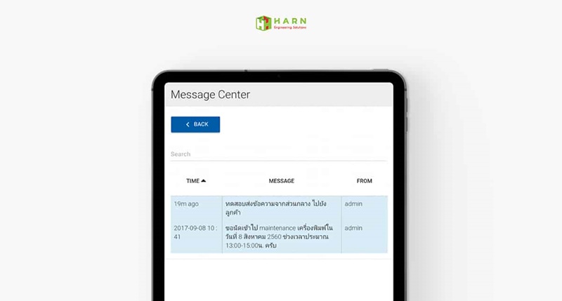 >ลูกค้าจะได้รับข้อความจากส่วนกลางโดยทีมเซอร์วิสของ Harn ซึ่งข้อความที่ลูกค้าได้รับจะเป็นการแจ้งเตือนสถานะผิดปกติของเครื่องที่ลูกค้าอาจจะยังไม่สังเกตเห็น เช่น หมึกใกล้จะหมด