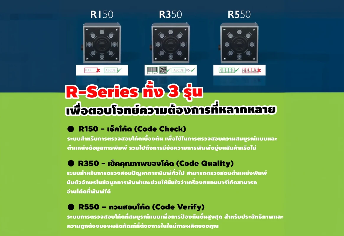 - R550 – Code Verify (: ระบบตรวจสอบขั้นสูงสุด เพื่อความถูกต้องและแม่นยำแบบครบวงจร เหมาะสำหรับผลิตภัณฑ์ที่ต้องการการควบคุมคุณภาพอย่างเข้มงวดที่สุด